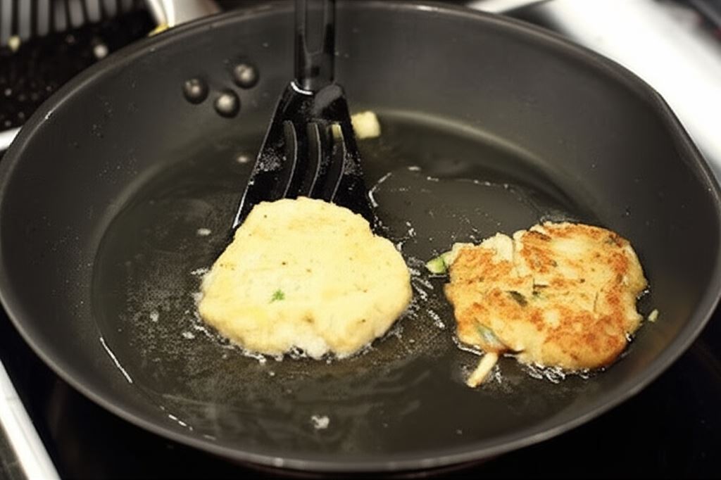 Uformuj z masy małe placuszki i usmaż je na złoty kolor po obu stronach. Serwuj ciepłe.