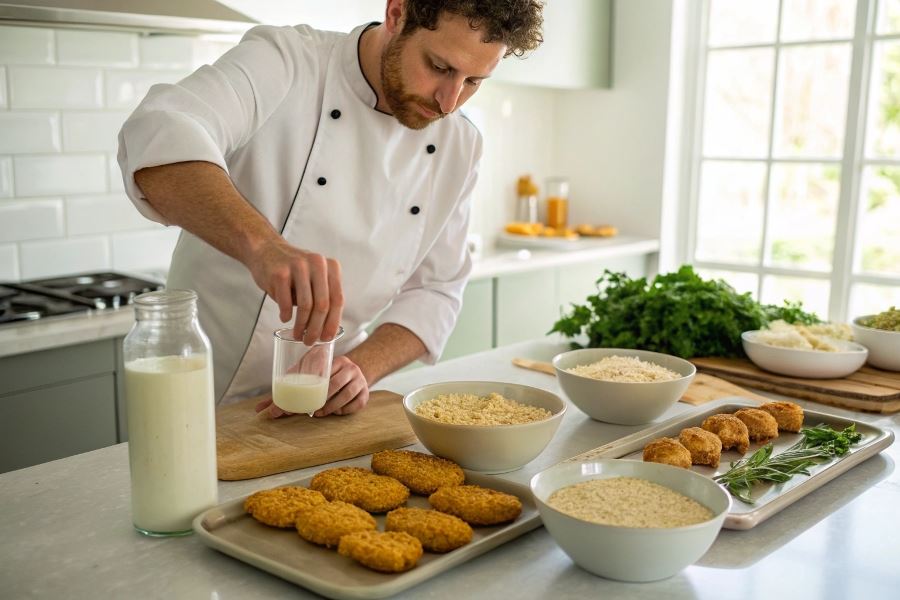 Sekret chrupiącej panierki bez jajka tkwi w podwójnym panierowaniu – najpierw w spoiwie, potem w panierce, a następnie powtórzenie całego procesu.