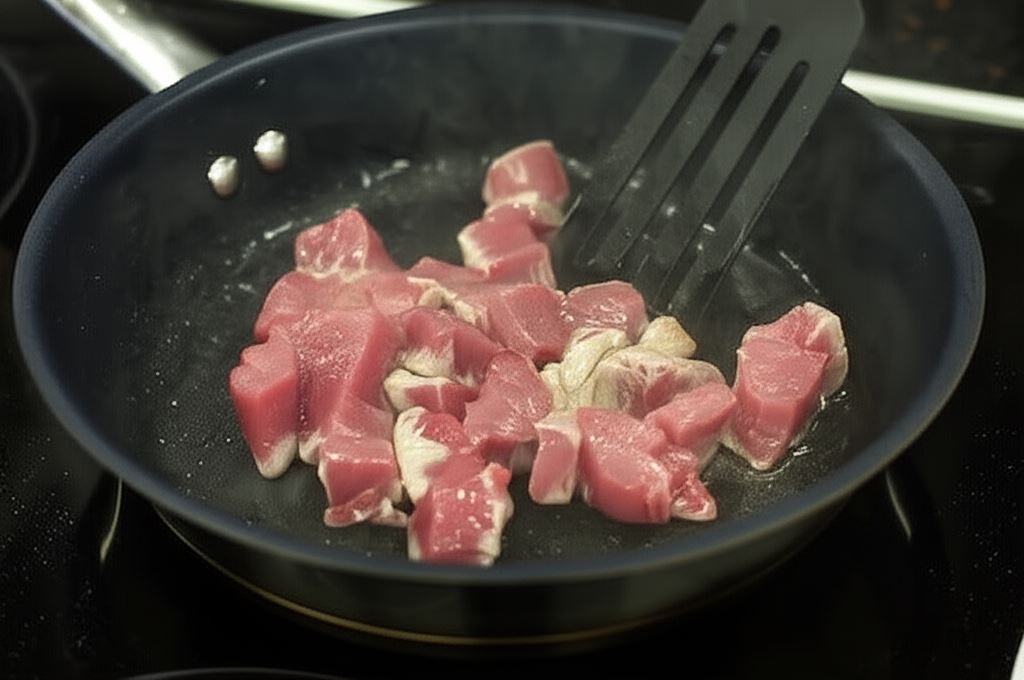 Oczyszczoną polędwiczkę pokrój w kostkę i obsmaż na łyżce oleju.