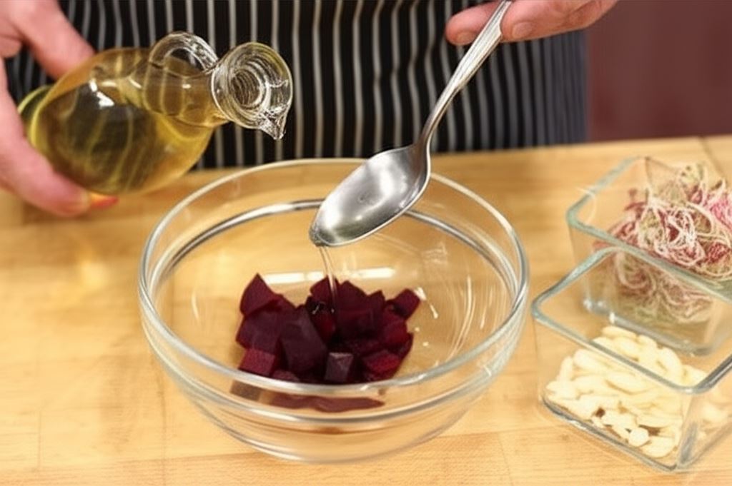 Ugotuj buraka. Posiekaj go drobno, wlej olej rzepakowy (½ łyżki), dodaj płatki migdałów i kiełki. Wszystko starannie wymieszaj. Serwuj z kaszą gryczaną i sokiem grejpfrutowym.