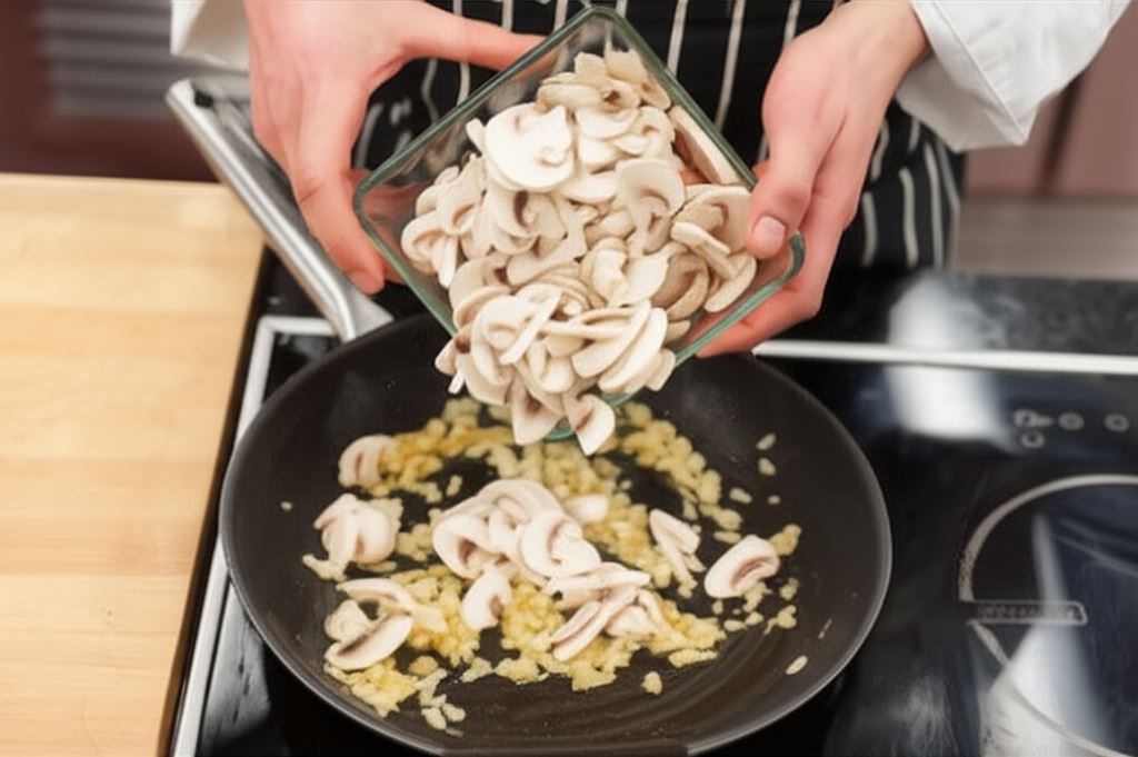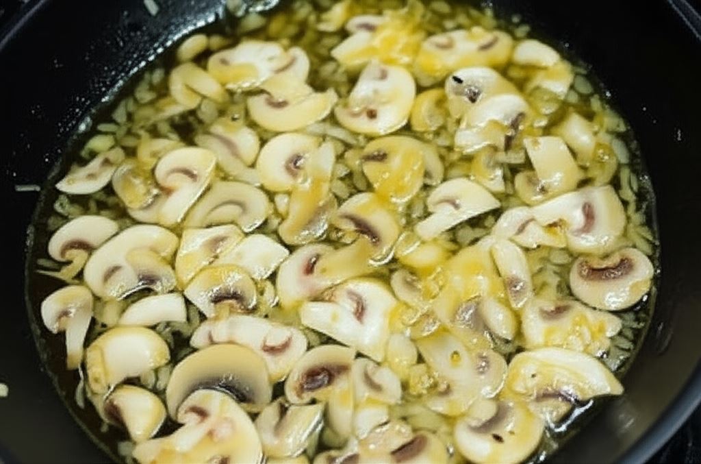 Na rozgrzanym tłuszczu, na tej patelni zrumień posiekaną w drobną kostkę cebulę oraz pokrojone w plastry grzyby.