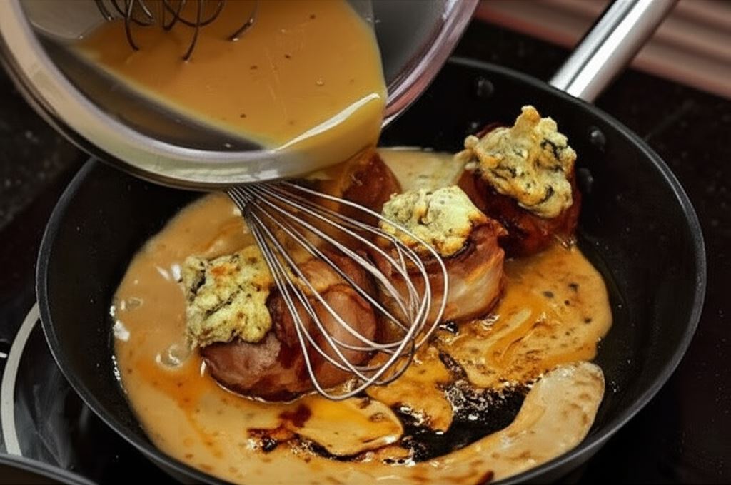 Polędwiczki przyrumień na patelni po obu stronach. Pozostaw mięso na patelni, a na jego wierzchu umieść warstwę chleba, a potem sera. Całość umieść w piekarniku na górnej półce i zapiekaj aż chleb tostowy z serem zrumieni się na złoty kolor (ostrożnie – patelnia będzie rozgrzana).