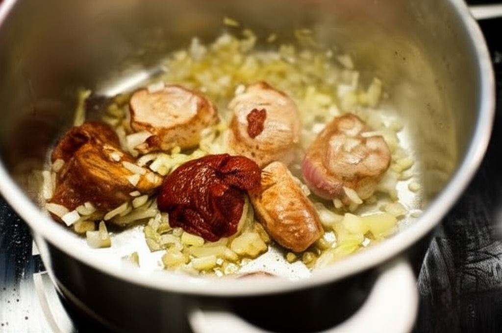 Przysmażaj z każdej strony w nagrzanym garnku. Odłóż na moment do innego naczynia. W tym samym garnku zrumień pokrojoną w kostkę cebulę, wsyp koncentrat pomidorowy, smaż około 2 minuty stale mieszając. Wlej ocet balsamiczny i miód. Wszystko gotuj aż ocet całkowicie wyparuje.
