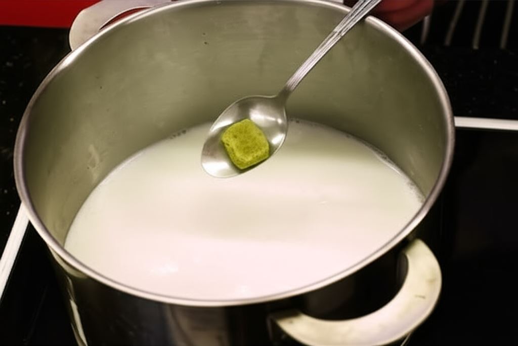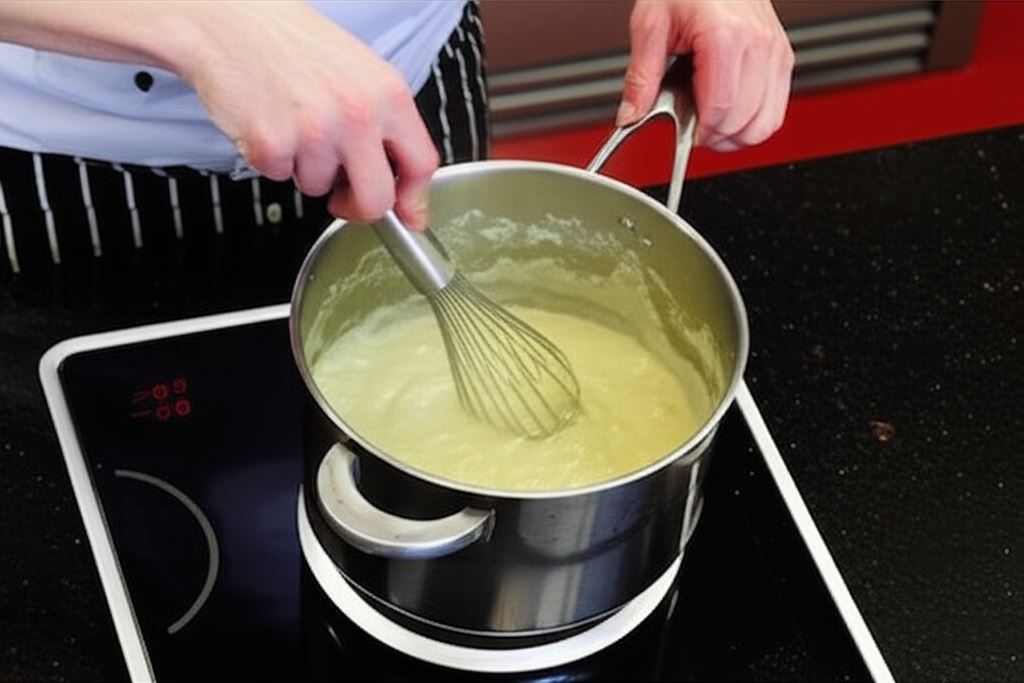 W garnku doprowadź do wrzenia 300 mililitrów wody wymieszanej ze 100 mililitrami mleka, wsyp Bulionetkę drobiową Knorr.