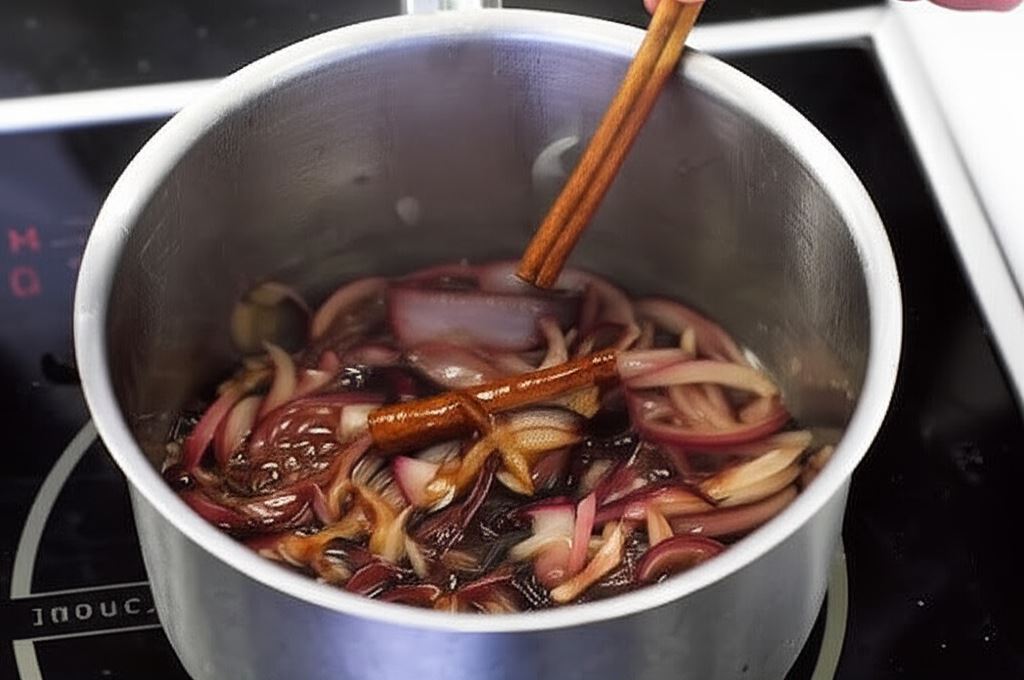 W tym czasie posiekaj cebule w piórka, w garnku skarmelizuj cukier, wrzuć cebulę, mieszaj podsmażając ją moment, wlej wino, sok i dodaj przyprawy. Gotuj wszystko, aż płyn całkowicie odparuje, wyjmij kawałki goździków i cynamonu, dodaj masło, całość zamieszaj.