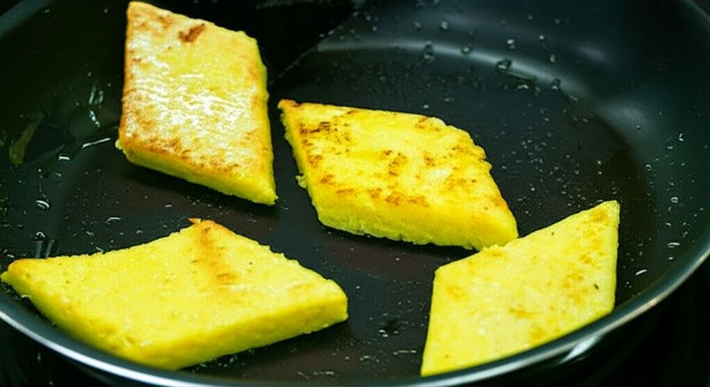 Schłodzoną polentę potnij w dowolnym kształcie na kawałki, na przykład na kostki, przyrumień je na złocisty kolor na patelni z powłoką teflonową lub grillu.