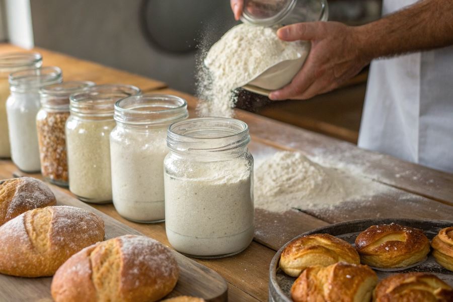 - Mąka żytnia (typ 720-2000) – bogata w błonnik, o niższej zawartości glutenu niż pszenna. Nadaje pieczywu charakterystyczny, lekko kwaskowaty smak i ciemniejszy kolor. Wymaga dłuższego wyrabiania i czasu fermentacji.