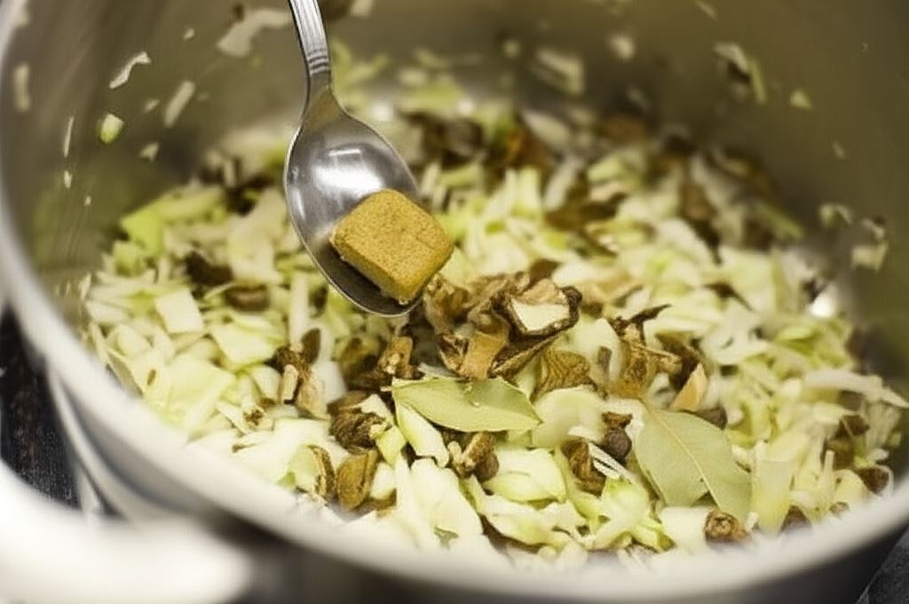 Cebulę posiekaj w kostkę. Kapustę poszatkuj drobniutko. W dużym garnku na rozgrzanym oleju zesmaż cebulę i kapustę. Dodaj liść laurowy, ziele angielskie, pokruszone grzyby oraz kostki Knorr. Kapustę gotuj do miękkości.