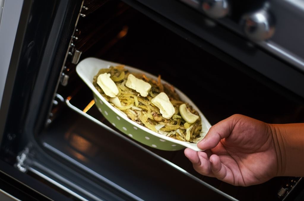 Na wierzch połóż kilka plasterków masła. Naczynie umieść w piekarniku rozgrzanym do temperatury 170 stopni. Piecz przez 45 minut. Posyp natką.