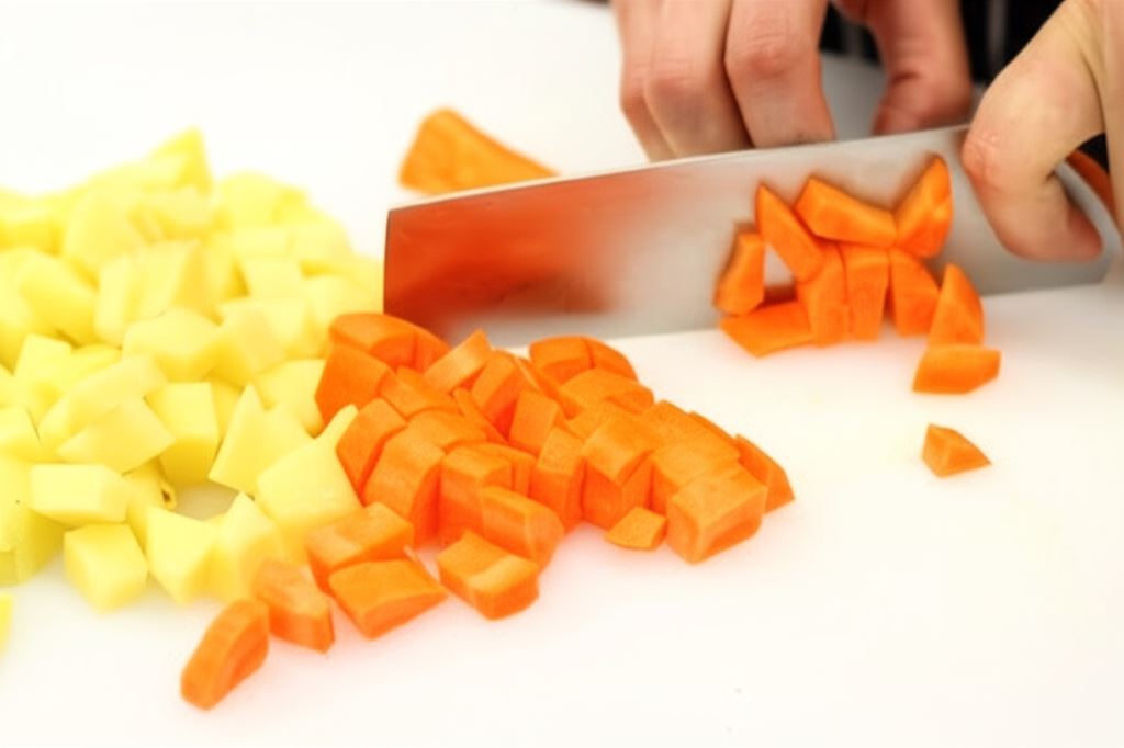 Obierz ziemniaki oraz marchew, po czym pokrój je w kostkę. Cebulę drobno posiekaj.