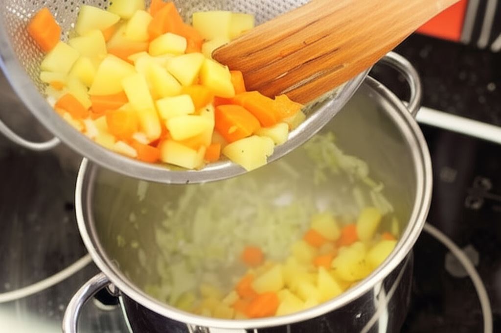 Doprowadź 2 litry wody do wrzenia. Wsyp ziemniaki, marchewkę, liść laurowy, masło oraz Przyprawę Uniwersalną Delikat Knorr. Gotuj pod przykryciem przez około 20 minut, aż zmiękną. Odcedź i wyjmij liść laurowy.