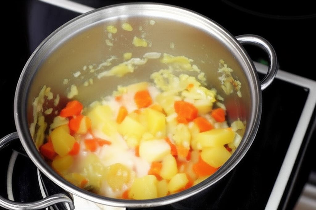 Podgrzej olej w garnku i zrumień w nim cebulę. Potem wsyp ugotowane ziemniaki i marchew. Wlej gorące mleko. Całość rozdrobnij tłuczkiem do ziemniaków.