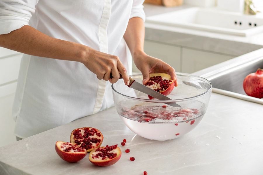 Krojenie granatu może być wyzwaniem ze względu na intensywnie barwiący sok. Zabezpiecz powierzchnię roboczą fartuchem kuchennym lub ręcznikiem papierowym, aby uniknąć trwałych plam. Najlepiej pracować na desce do krojenia z rowkiem na soki lub w płaskiej misce, która zatrzyma uciekające ziarna.