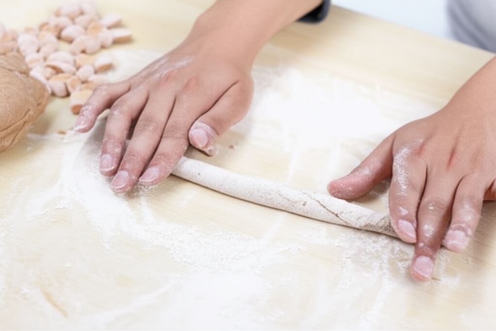 Uformuj w rękach wałeczki z ciasta (w razie potrzeby obsyp je dodatkową mąką), pokrój na kopytka i ugotuj w delikatnie osolonej wodzie około 2 minut.