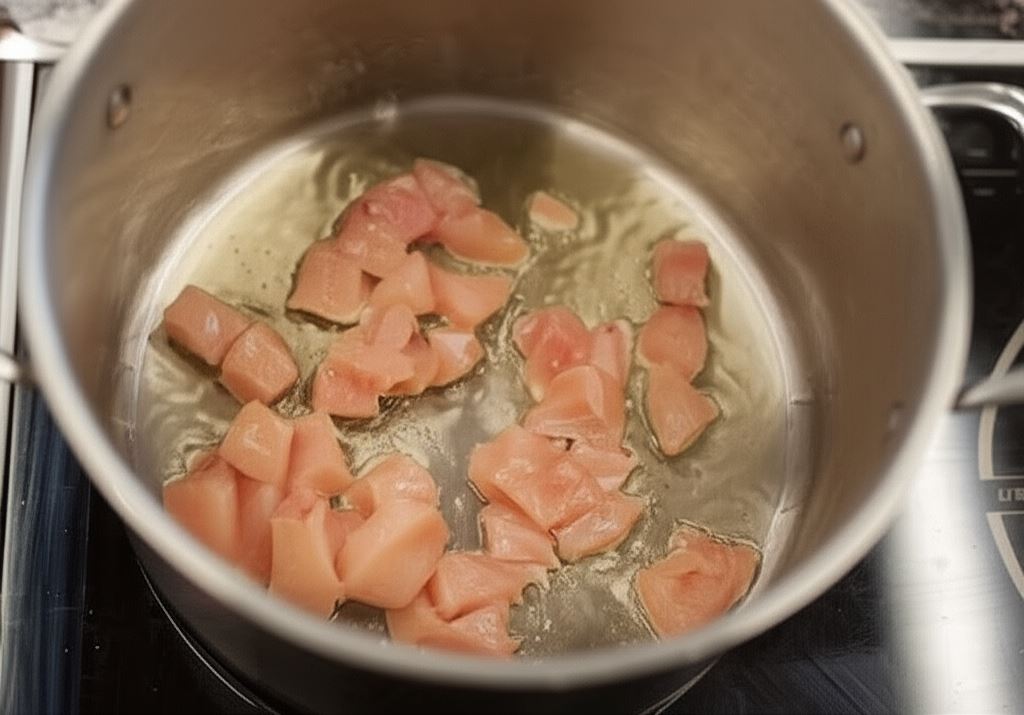 Filety z kurczaka pokrój w małą kostkę i obsmaż w garnku na rozgrzanej oliwie.