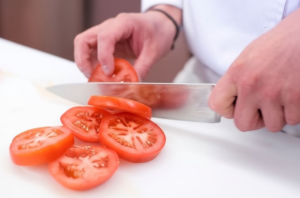 Pomidory opłucz, wysusz i pokrój na plastry o średniej grubości.