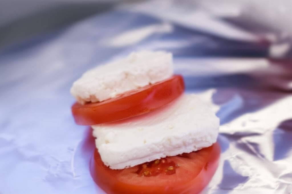 Na fragmencie folii aluminiowej umieszczaj naprzemiennie plastry pomidorów i plastry sera.