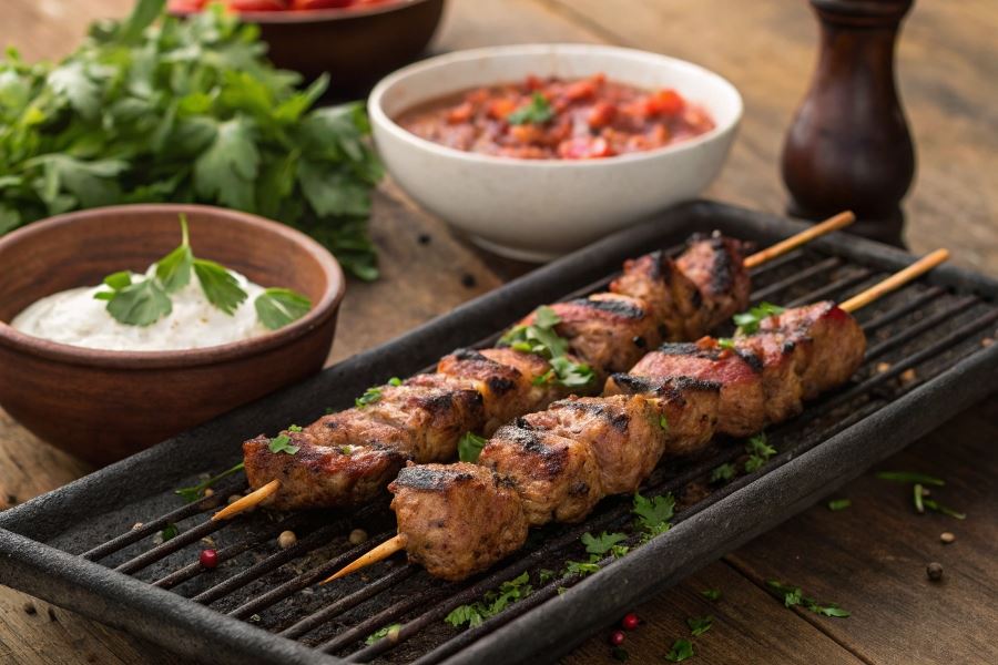 Temperatura grilla powinna wynosić około 200-220°C. Umieść lula kebaby na rozgrzanym grillu i piecz przez 3-4 minuty z każdej strony, obracając co jakiś czas, aby uzyskać równomierne wypieczenie. Całkowity czas grillowania nie powinien przekraczać 10-12 minut – zbyt długie pieczenie spowoduje wysuszenie mięsa.
