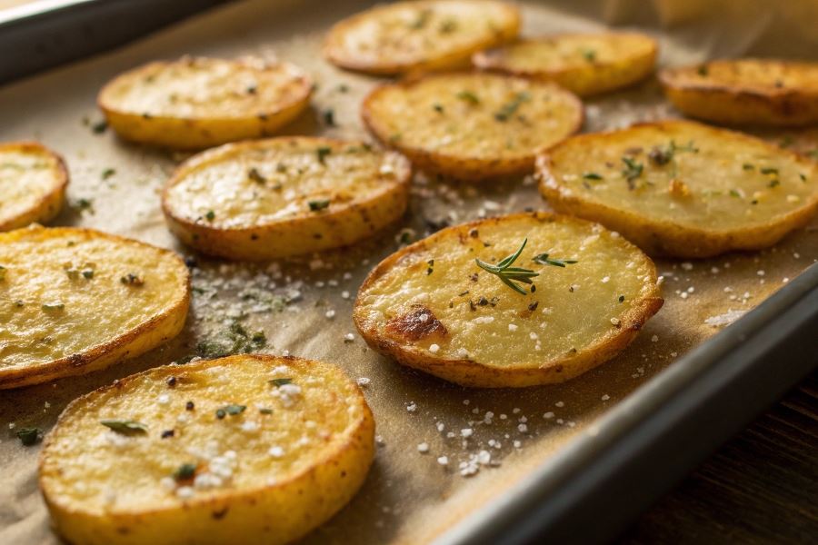Przed pieczeniem warto namoczyć pokrojone talarki w zimnej wodzie przez 15-20 minut, co usunie nadmiar skrobi i zapewni chrupkość. Po osuszeniu papierowym ręcznikiem, przypraw ziemniaki przed umieszczeniem w piekarniku: