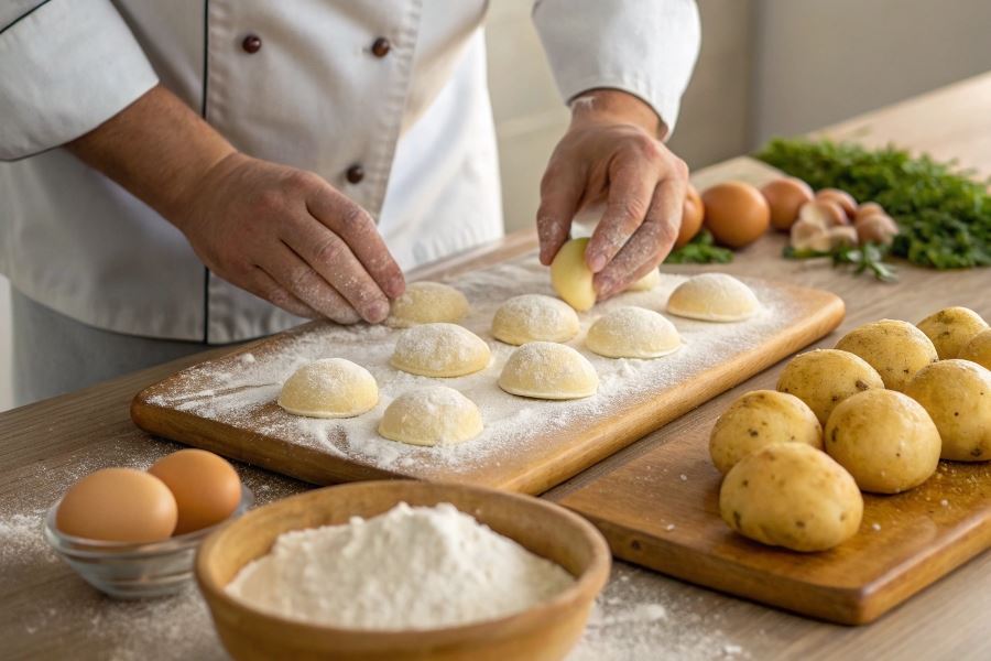 Wskazówka eksperta: Ilość mąki może się różnić w zależności od wilgotności ugotowanych ziemniaków. Dodawaj ją stopniowo, aż ciasto przestanie się kleić do rąk, ale pozostanie elastyczne.