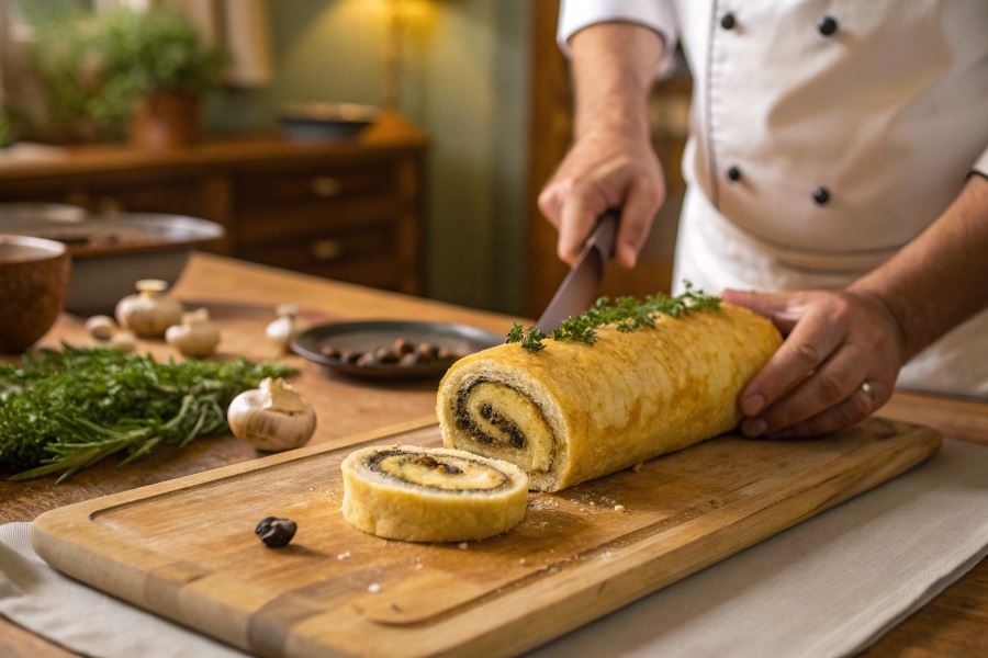Rada szefa kuchni: Roladę najlepiej podawać przekrojoną na plastry o grubości 2-3 cm, z sosem grzybowym na bazie śmietanki 30% i białego wina. Dla kontrastu tekstur, serwuj z chrupiącą sałatką z rukoli i prażonych orzechów.
