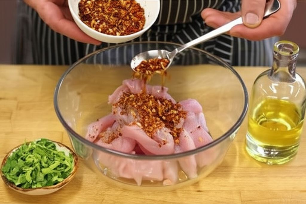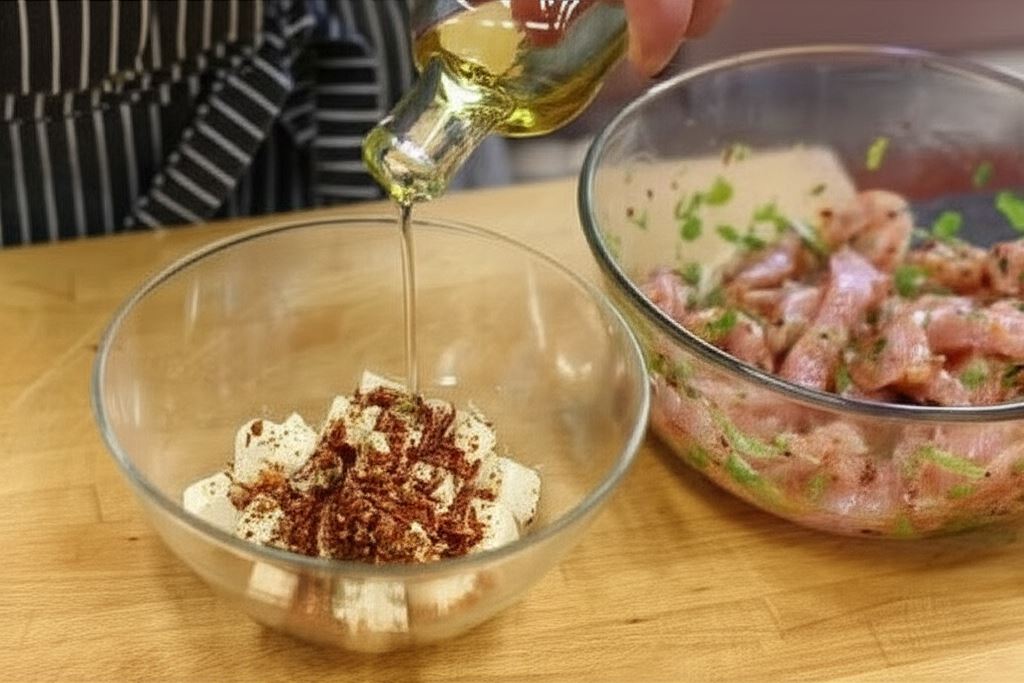 Mięso osusz i potnij w paski. Umieść w misce, wlej oliwę (3 łyżki), wsyp połowę Przyprawy Knorr oraz drobno posiekaną kolendrę. Wszystko wymieszaj i odstaw na 15 minut.