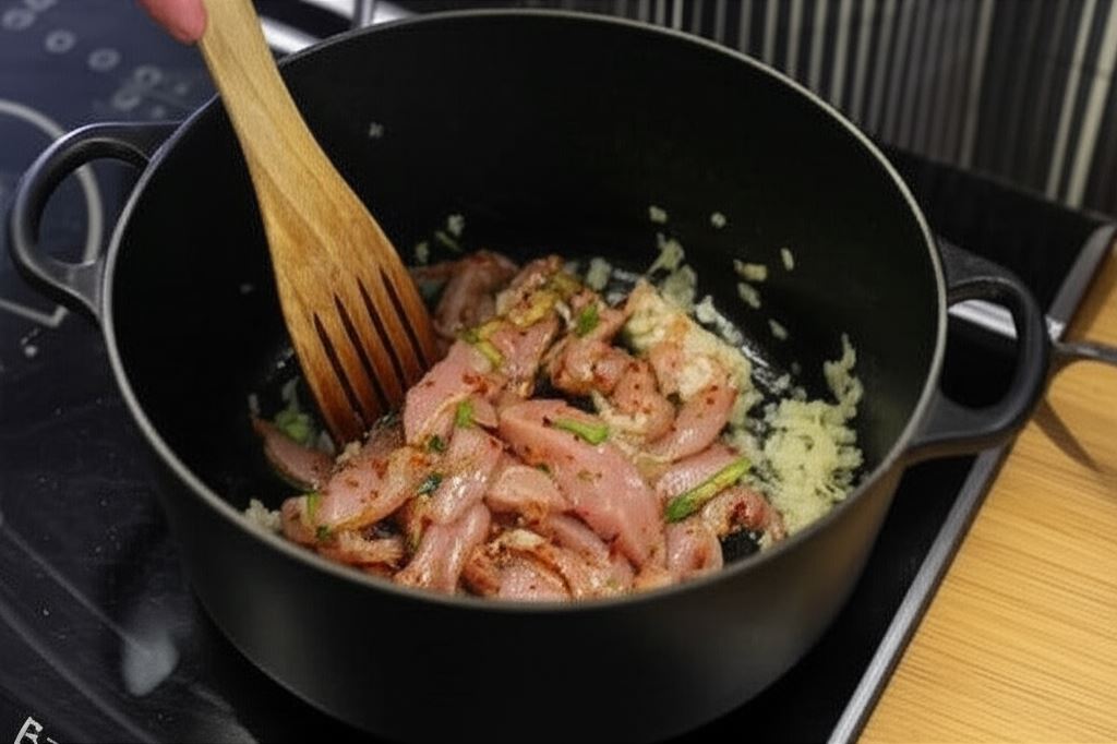 Cebulę posiekaj w małą kostkę i przesmaż na pozostałej oliwie w garnku. Dorzuć zamarynowane mięso i smaż aż uzyska złoty kolor.