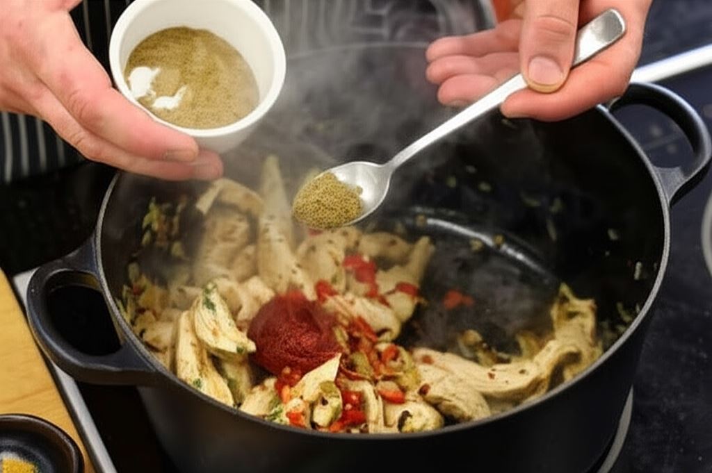 Po upływie tego czasu wsyp kmin rzymski, curry, koncentrat pomidorowy, posiekaną papryczkę chilli i smaż przez moment razem.