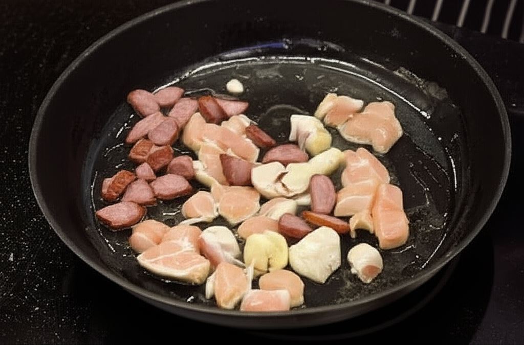 Kurczaka pokrój w kostkę o grubości centymetra, a kiełbasę jałowcową w półplastry. Drób obsmaż na rozgrzanym tłuszczu, dołóż kiełbasę i wszystko smaż przez około 4 minuty, od czasu do czasu mieszając.