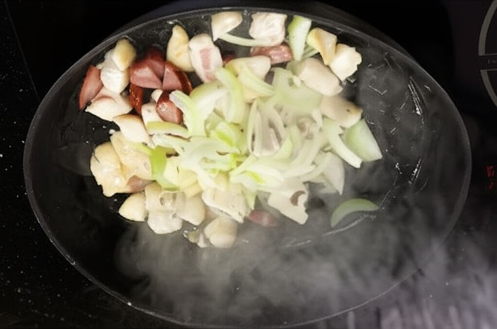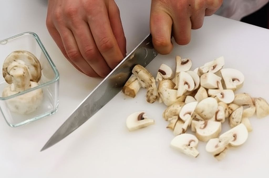 Wrzuć na patelnię cebulę, czosnek oraz pieczarki.