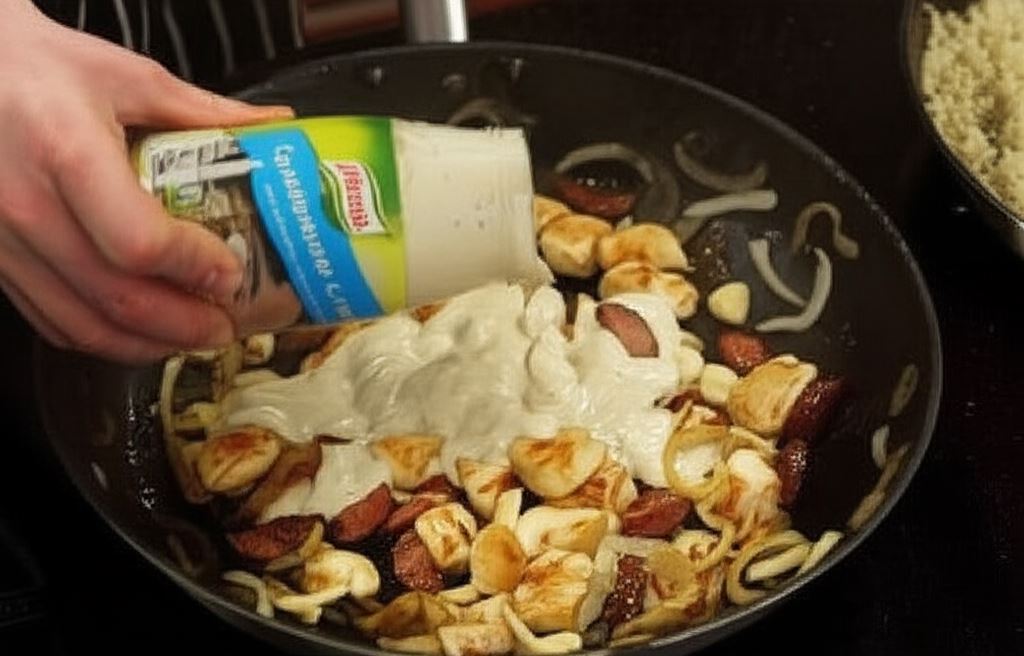 Podsmaż jeszcze moment, po czym zalej Sosem w słoiku Śmietanowo - grzybowym Knorr.