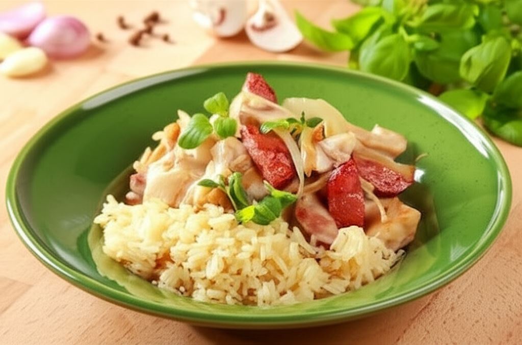 Sekret tej potrawy tkwi w idealnym połączeniu składników. Kurczak zachowuje swoją soczystość, a pieczarki dodają leśnego aromatu. Cebula i czosnek wprowadzają głębię smaku, podczas gdy kiełbasa jałowcowa zapewnia przyjemny, lekko wędzony akcent. Wszystko to łączy się w kremowym sosie, który idealnie komponuje się z puszystym ryżem.