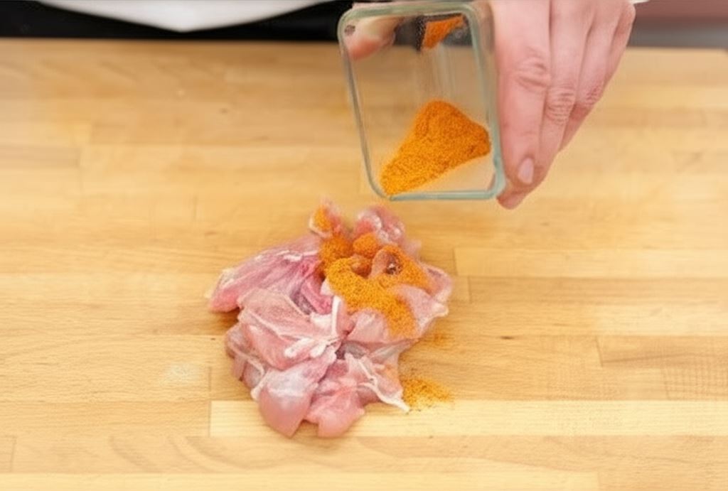 Udka podziel na cztery części, posyp przyprawą do mięs i zrumień na rozgrzanym tłuszczu.