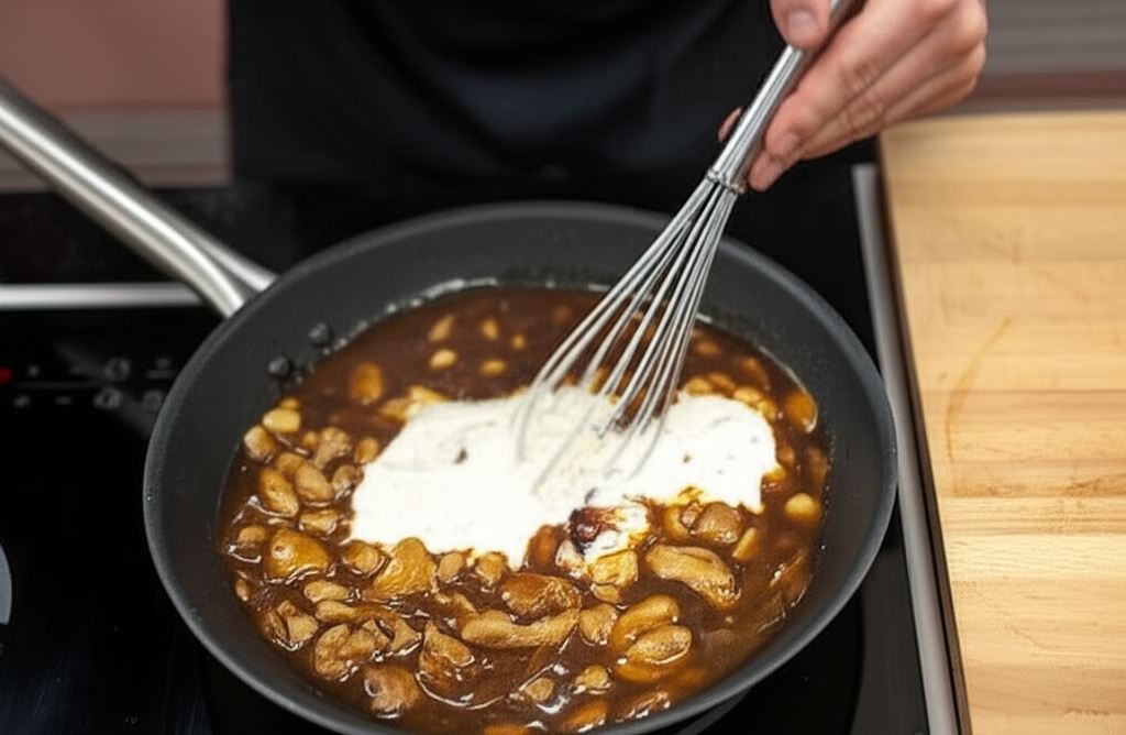 Potrawkę gotuj pod pokrywką przez 20 minut, aż mięso stanie się całkowicie miękkie. Na końcu dodaj śmietanę i przypraw niewielką ilością majeranku. Potrawka doskonale smakuje serwowana z kaszą gryczaną.