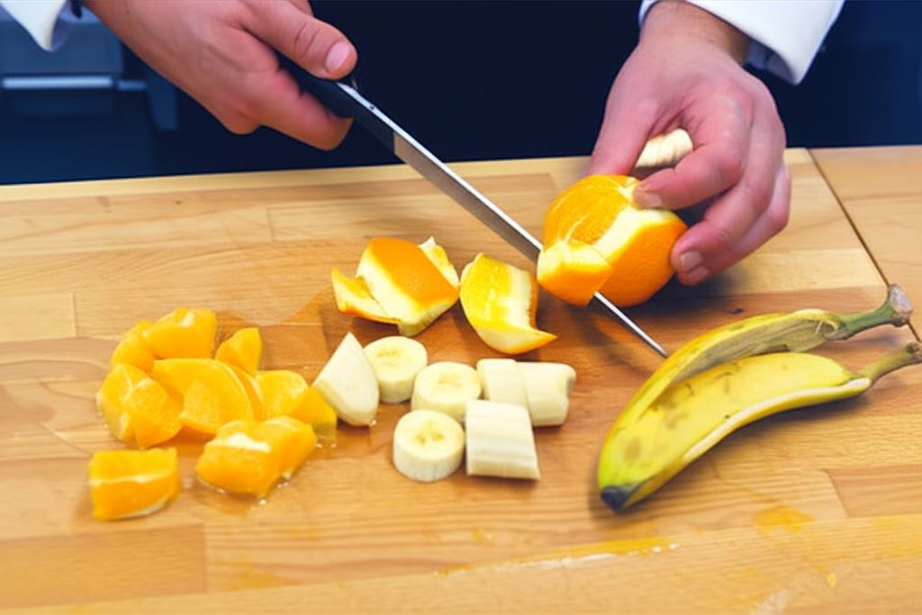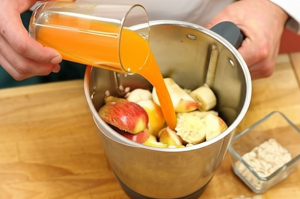 Obierz pomarańczę i banana, pokrój je i umieść w blenderze. Dodaj obrany korzeń imbiru i płatki owsiane.
