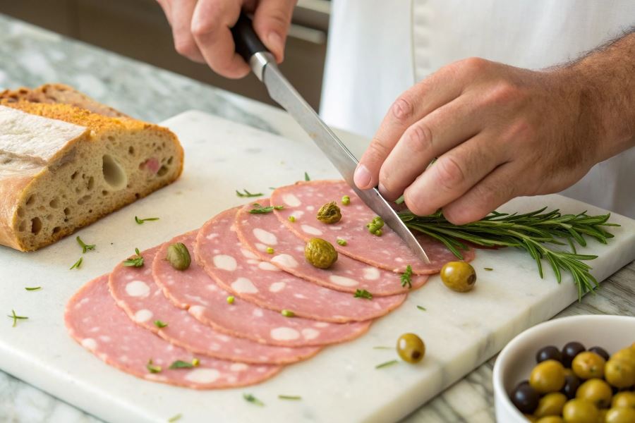 Aby zachować najlepszy smak mortadeli, należy przechowywać ją w temperaturze 2-4°C, zawinięta w papier pergaminowy lub folię spożywczą. Premium mortadelę najlepiej podawać w temperaturze pokojowej (15-20 minut po wyjęciu z lodówki), co pozwala wydobyć pełnię jej aromatu. Krojenie powinno odbywać się bezpośrednio przed podaniem, na cieniutkie plastry za pomocą ostrego noża lub profesjonalnej krajalnicy.