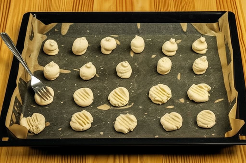 Każde przyciśnij delikatnie nawilżonym widelcem i piecz w 170C przez 10-15 minut.