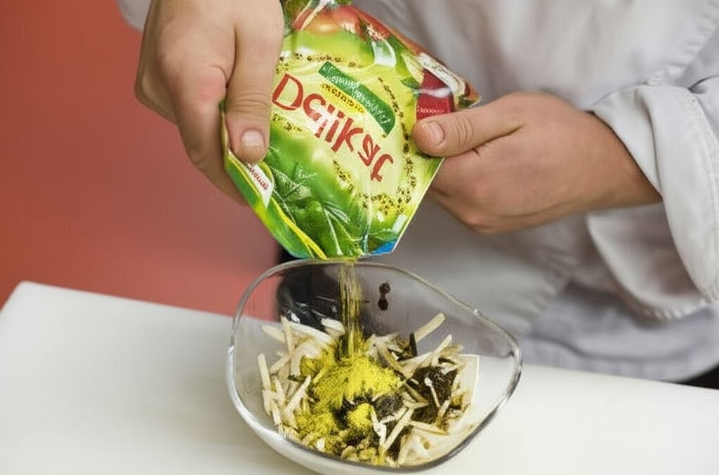 Wsyp starty ser i przypraw całość łyżeczką przyprawy Knorr.