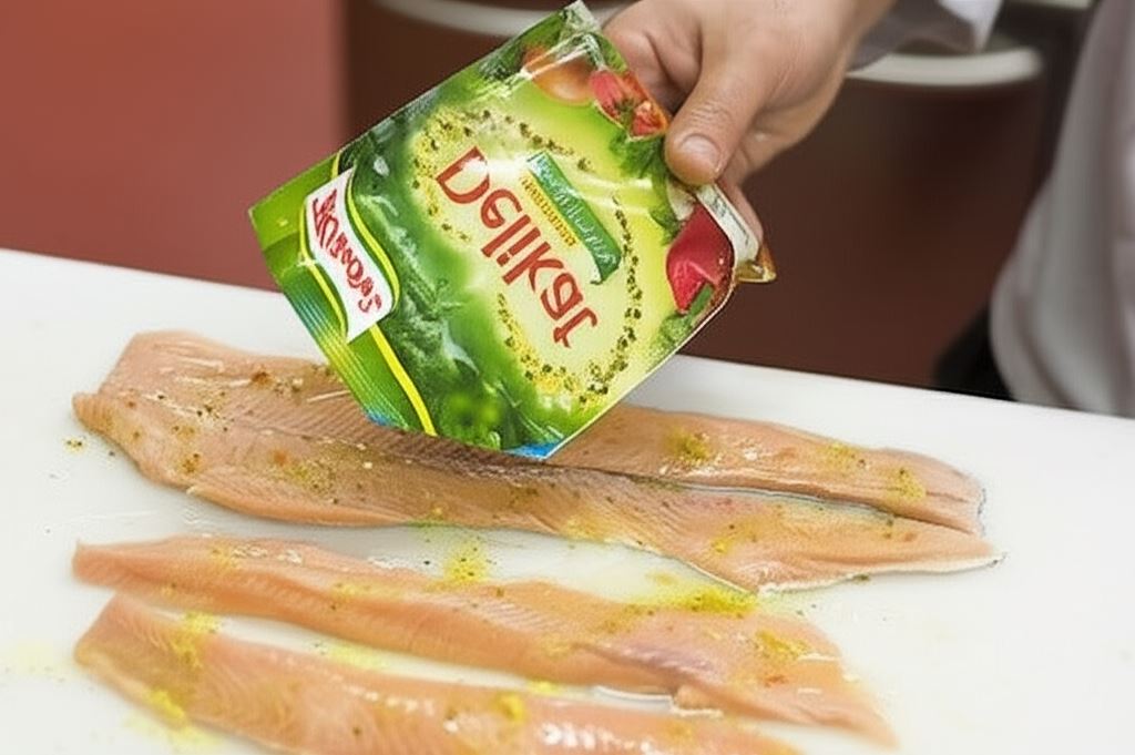 Pstrąga filety skrop oliwą i przyprawą Knorr posyp.