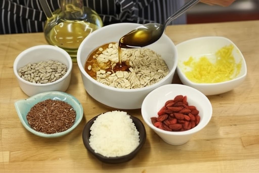Owsiane płatki wsyp do miski, zalej je syropem klonowym, dodaj startą skórkę cytrynową, oliwę, nasiona goi, kokosowe wiórki, siemię oraz nasiona słonecznika. Wszystko starannie wymieszaj, aby płatki zostały pokryte niewielką ilością syropu klonowego.