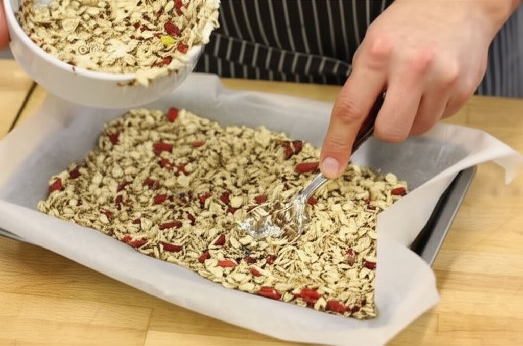 Rozłóż wszystko na pergaminem wyłożonej blasze do pieczenia. Umieść na 10-15 minut w piekarniku rozgrzanym do 180°C, dopóki płatki nie staną się złociste, a syrop klonowy nie skarmelizuje się. Przygotowaną w ten sposób granolę pozostaw z boku do ostygnięcia, po czym delikatnie rozdrobnij.