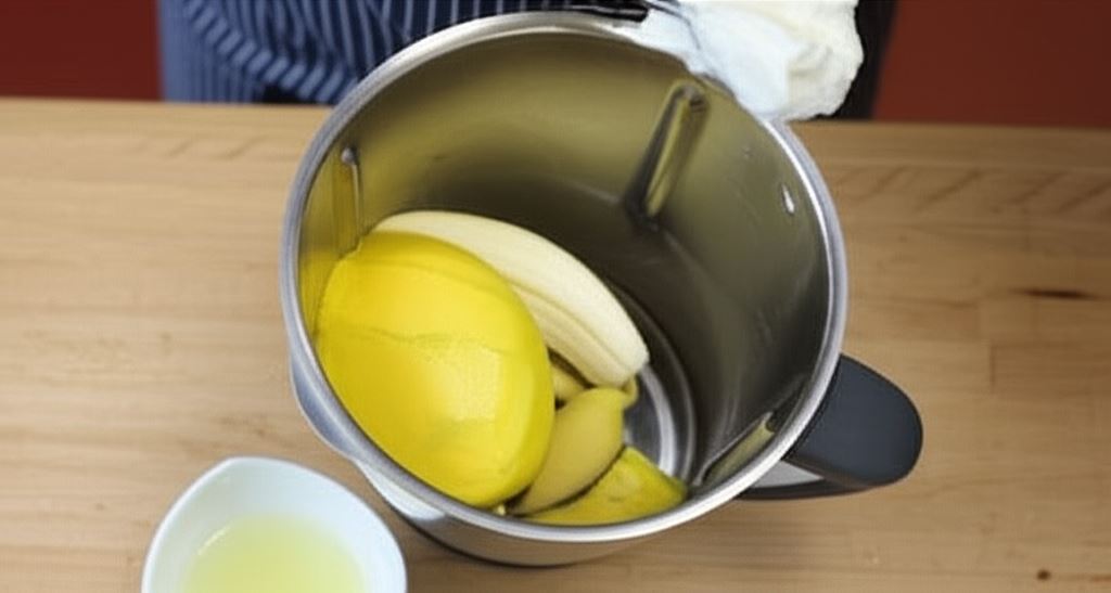 Obierz mango i wyjmij pestkę. Mango, banana, sok z cytryny, kurkumę oraz 300 g jogurtu włóż do kielicha miksera i dokładnie zmiksuj.