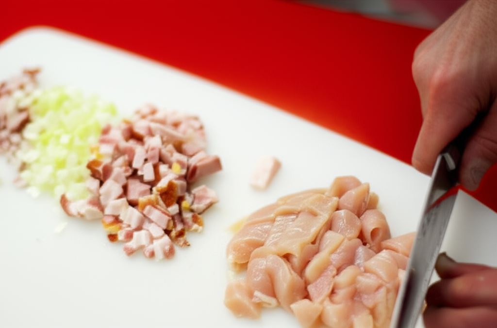 Cebule, pora, czosnek i boczek posiekaj na drobne kawałki, kurczaka na nieco większe.
