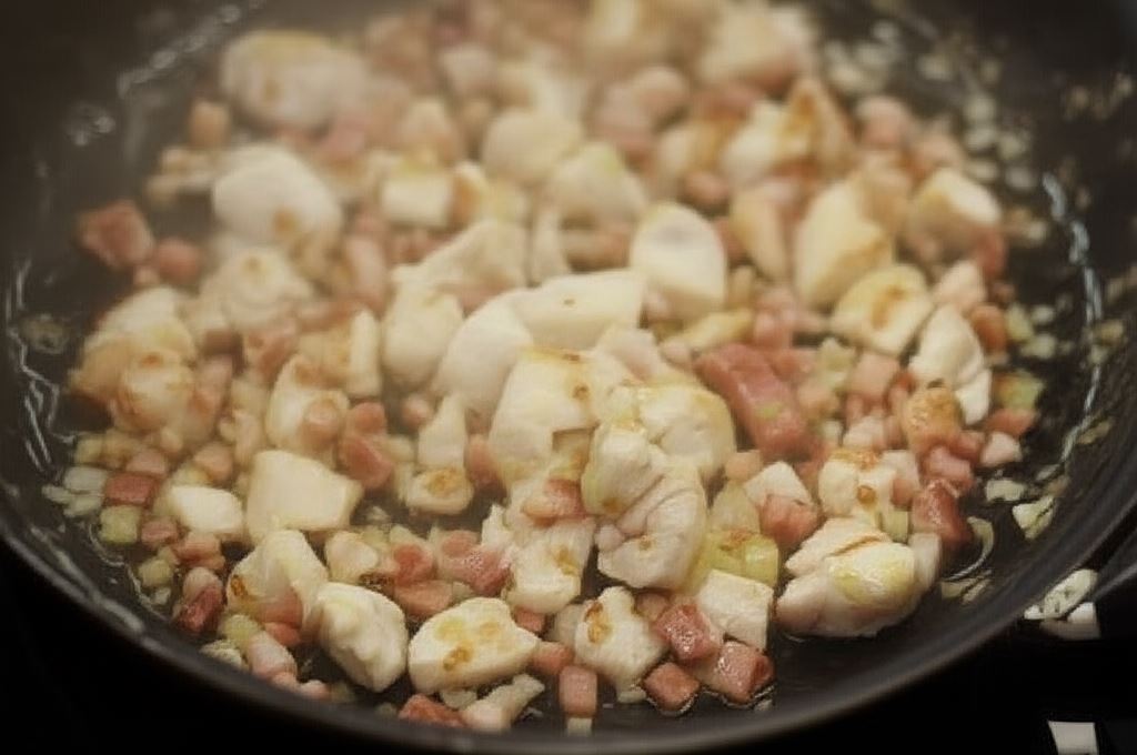 Na tłuszczu zrumień cebulę, czosnek i pora. Po chwili dorzuć boczek oraz kurczaka. Kiedy wszystko się przyrumieni, przenieś składniki do miski.