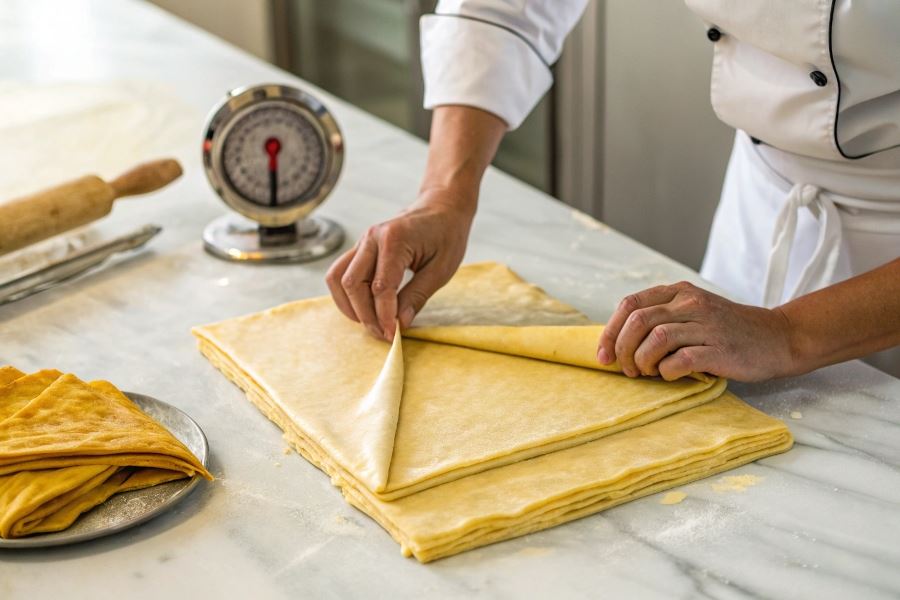 Wskazówka eksperta: Przed pieczeniem schłodź uformowane ciasto francuskie w lodówce przez 15-20 minut. Zimne ciasto lepiej zachowuje kształt i wyraźniej rozwarstwia się podczas pieczenia.