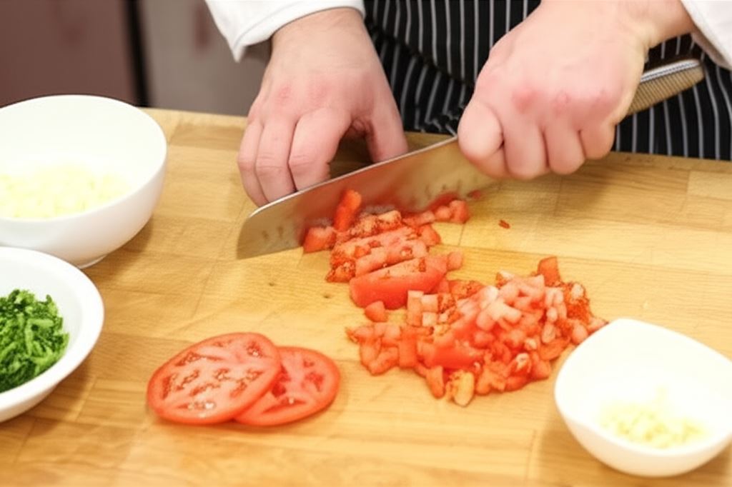 Cebulę i pomidory posiekaj w drobną kostkę, a ząbki czosnku i natkę kolendry drobno pokrój.