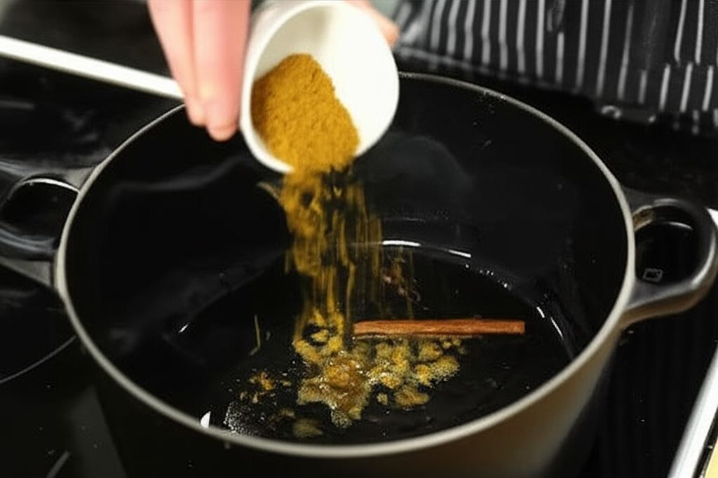 W garnku na rozgrzanym tłuszczu podsmażaj cynamon, goździki i przyprawę curry. Smaż te przyprawy przez około 15 sekund, dopóki nie zaczną intensywnie pachnieć, następnie dodaj czosnek oraz cebulę i smaż całość razem, aż cebula zacznie się zrumieniać.