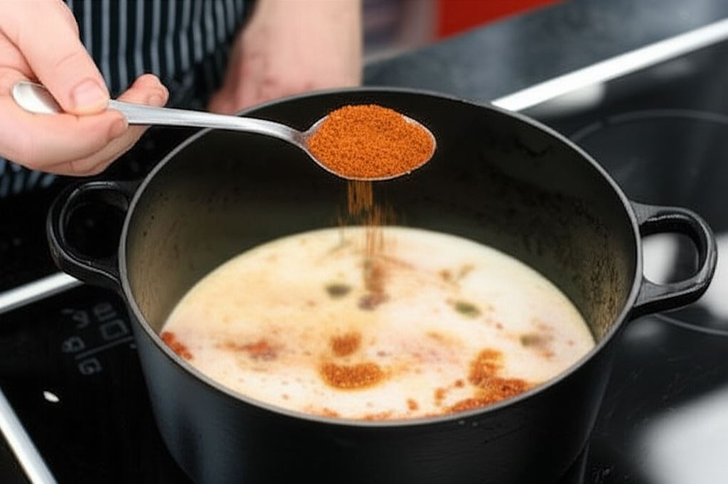 Wrzuć pomidory i smaż całość razem przez następną minutę, następnie dodaj mleko kokosowe i resztę opakowania Knorr.