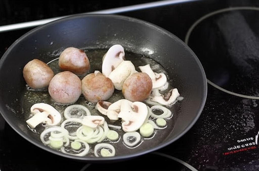 Pulpety posyp mąką i przyrumień na gorącym tłuszczu. Wrzuć pokrojoną w plastry cebulę oraz pieczarki. Smaż całość razem, od czasu do czasu mieszając.