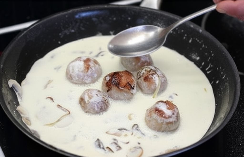 Zalej pulpety śmietaną wymieszaną z jedną szklanką wody. Gotuj całość na małym ogniu pod pokrywką przez około 5 minut. Dopraw sos na końcu kostką rosołową drobiową Knorr.